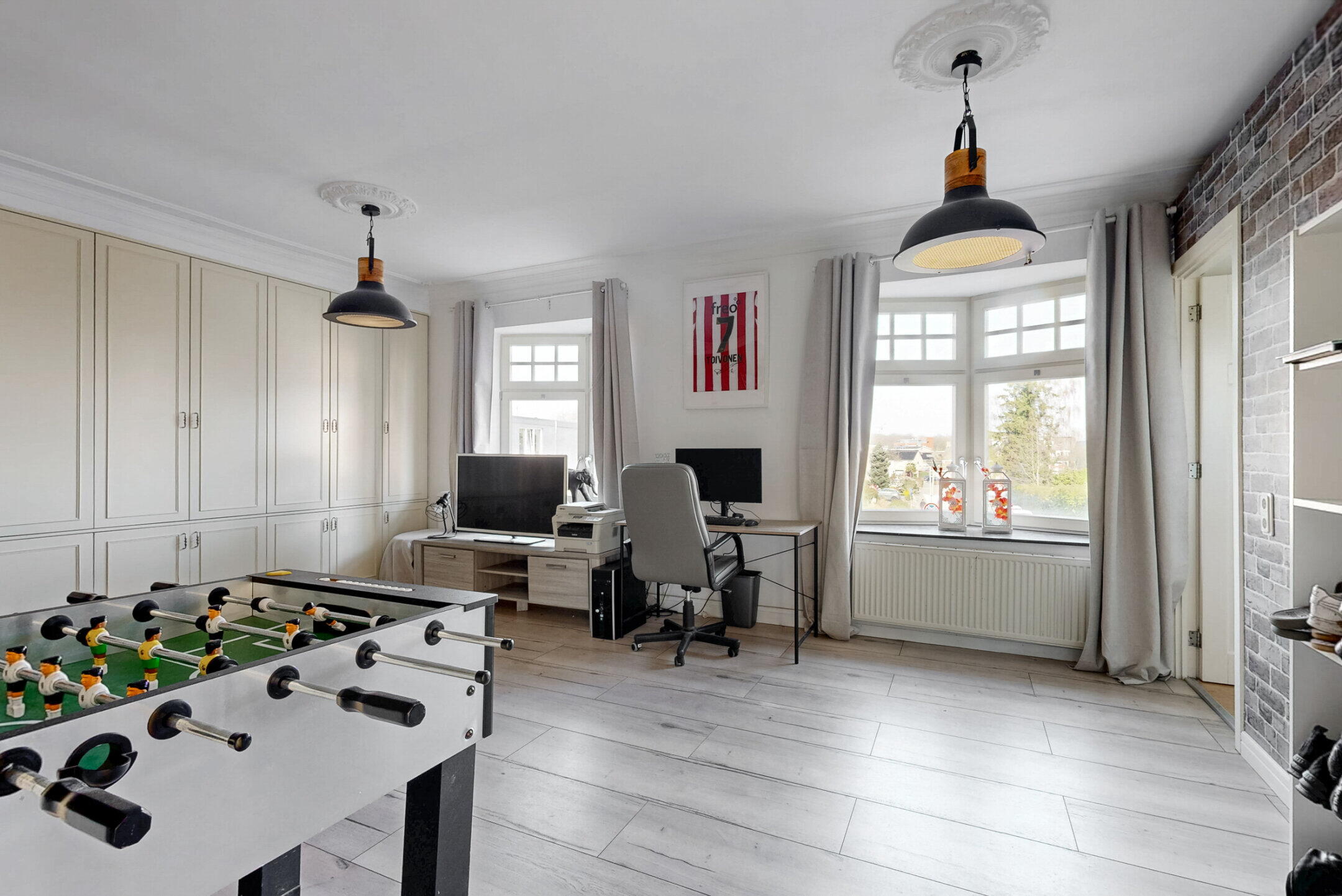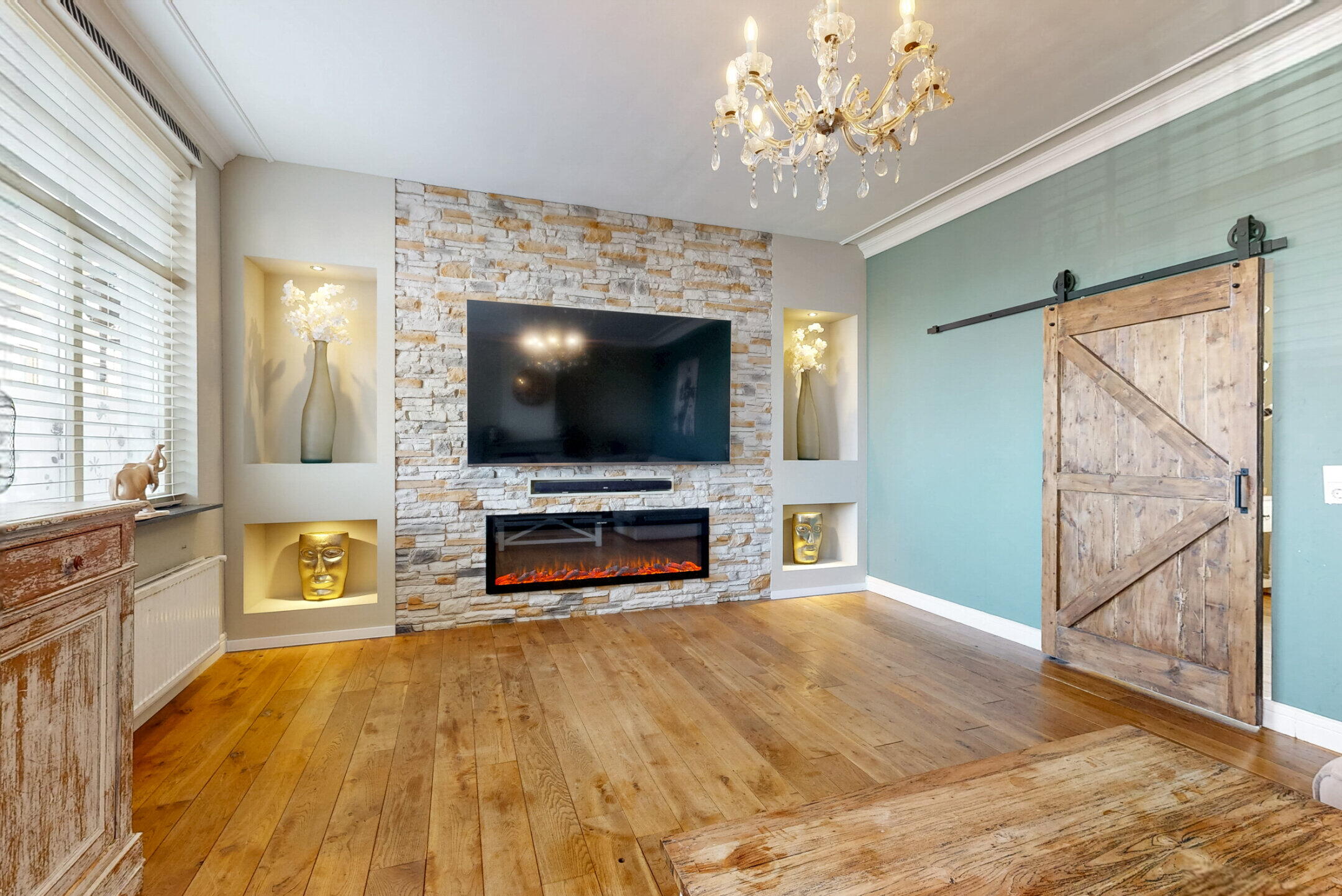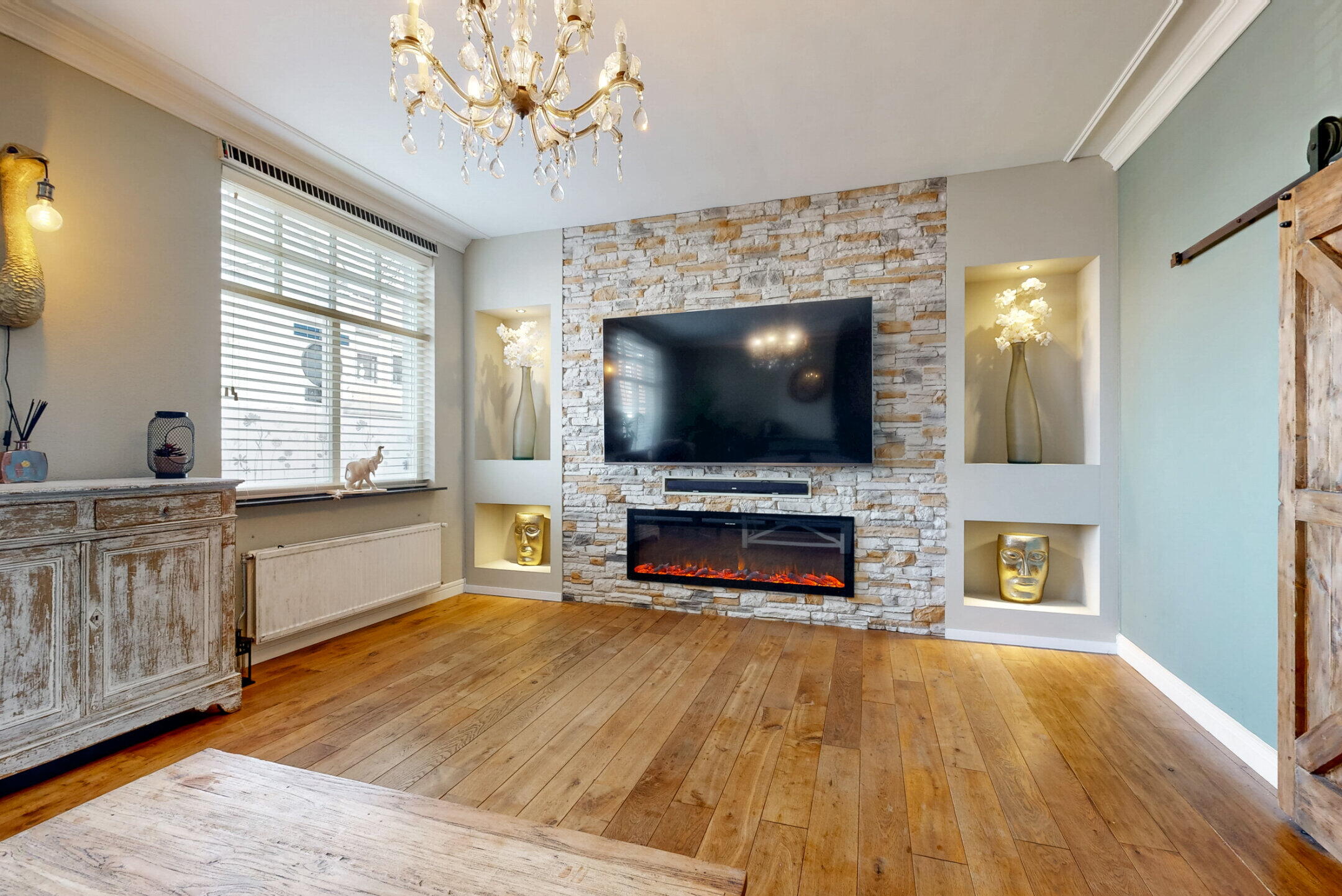 Vanuit de eetkamer kom je via een schuifdeur in de ruime woonkamer van bijna 30 m2. Deze is voorzien van elektrische haard/sfeerhaard. De oude schouw is er voor de sier, het rookkanaal is weg. De ramen zijn extra isolerend, zodat er geen/nauwelijks geluid van buitenaf hoorbaar is.
