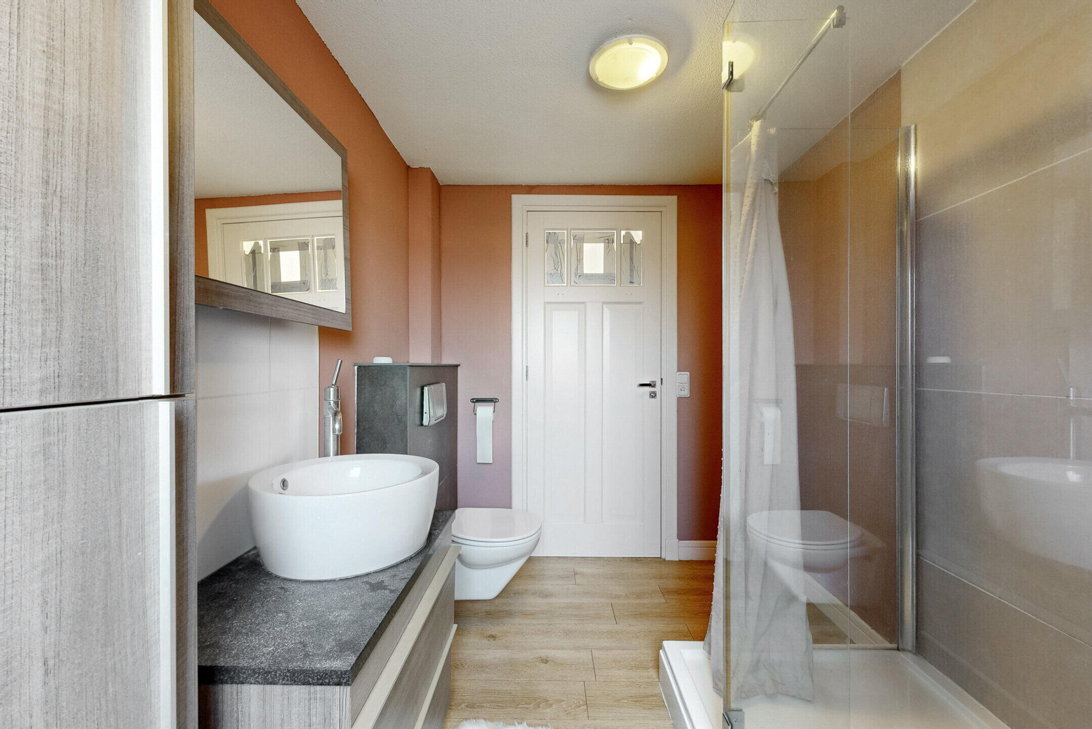 De badkamer (ca. 7 m2) is vanuit beide slaapkamers via de overloop bereikbaar en heeft een fraaie wastafel, 3e toilet en ruime inloopdouche.