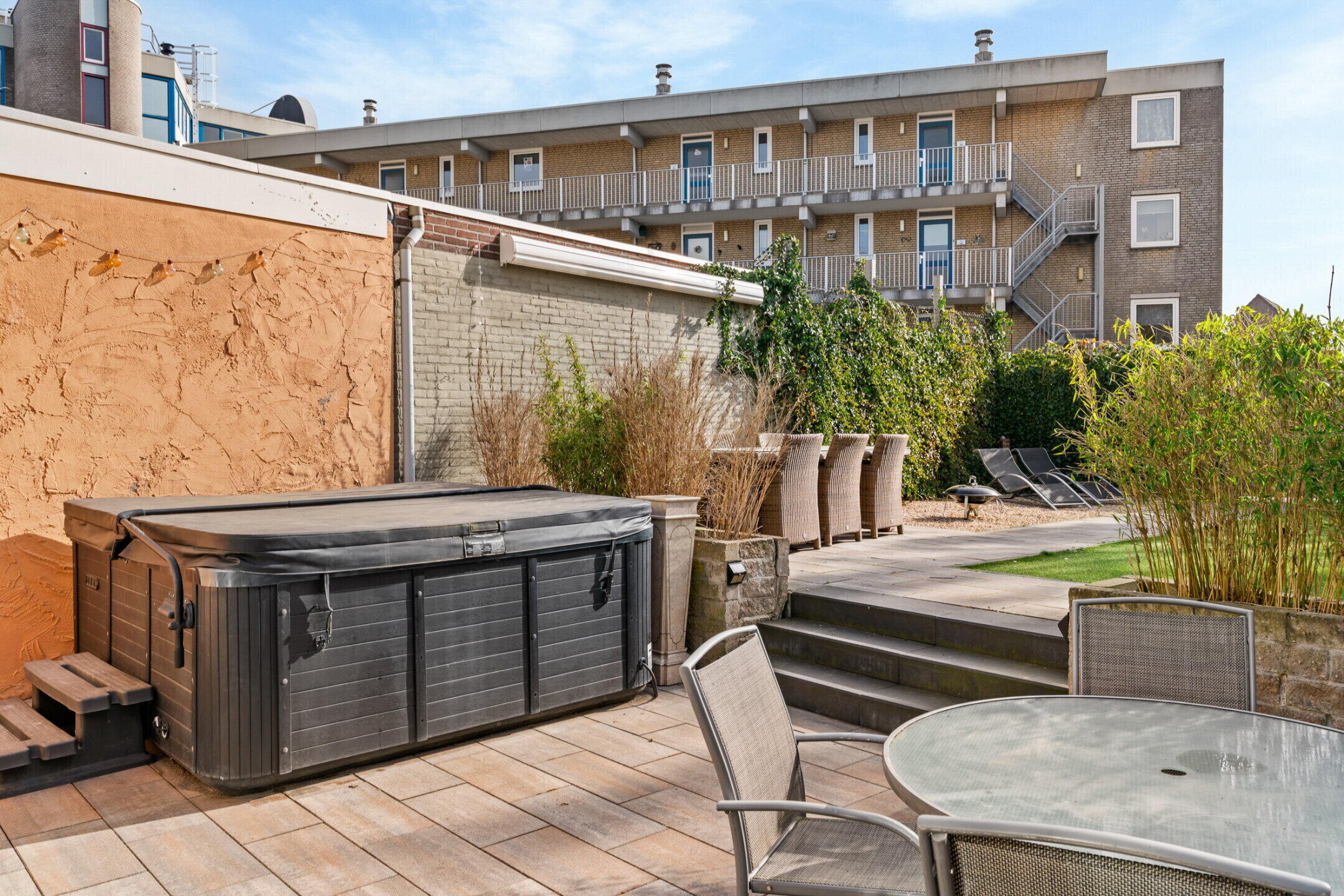 De tuin is de laatste jaren volledig op de schop gegaan en verdeeld in twee niveaus en drie delen en is gezamenlijk ca. 300 m2. De serre, het middenstuk dat hoger ligt en deels voorzien is van kunstgras en deels verhard en dan heb je nog de parkeerplaatsen en kunststof berging, direct achter de dubbele elektrische poorten. Op het middenstuk kan men heerlijk genieten van de jacuzzi (ter overname) en een elektrische zonwering aan de lange muur zorgt zelfs voor de nodige schaduw tijdens de warme zomer.