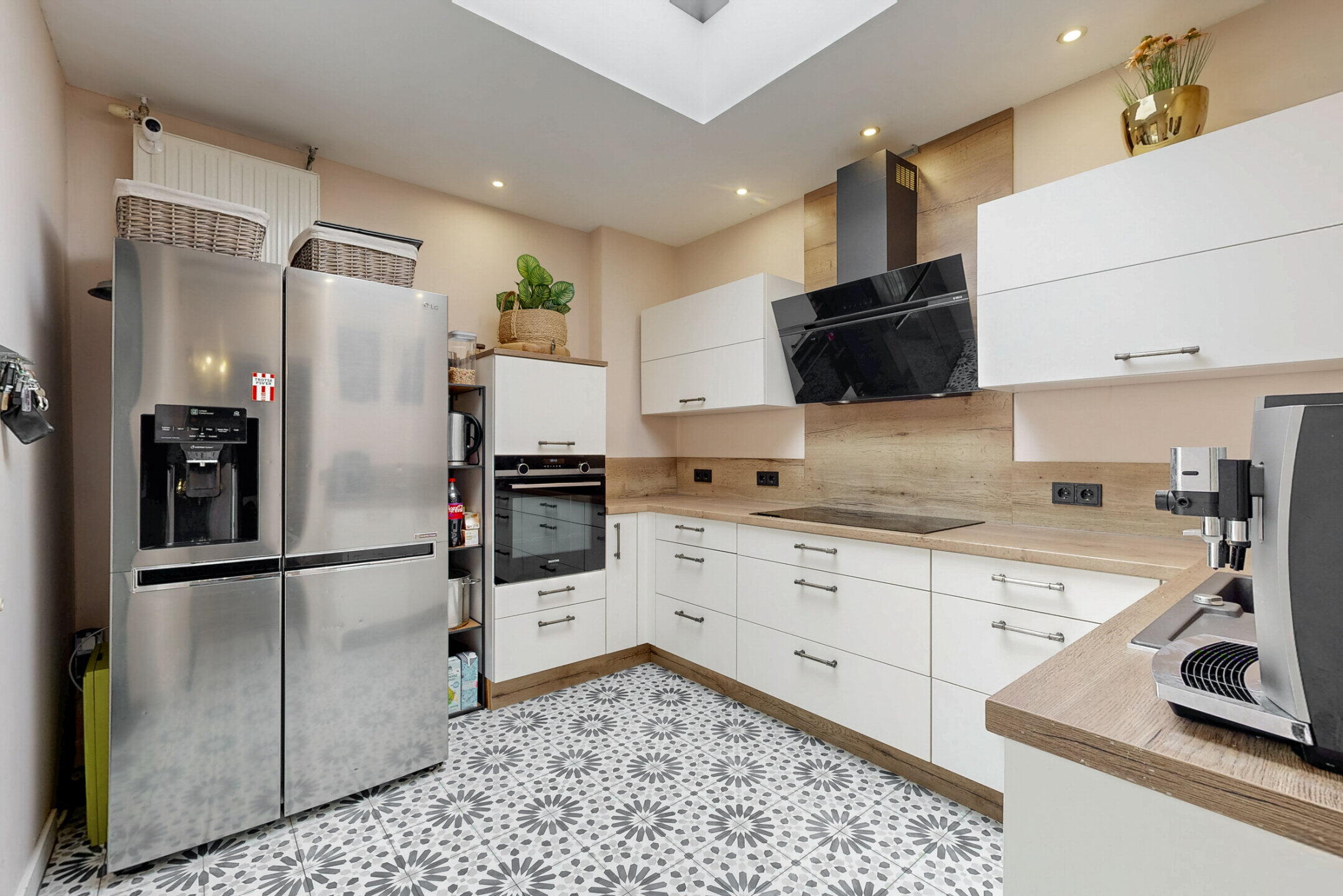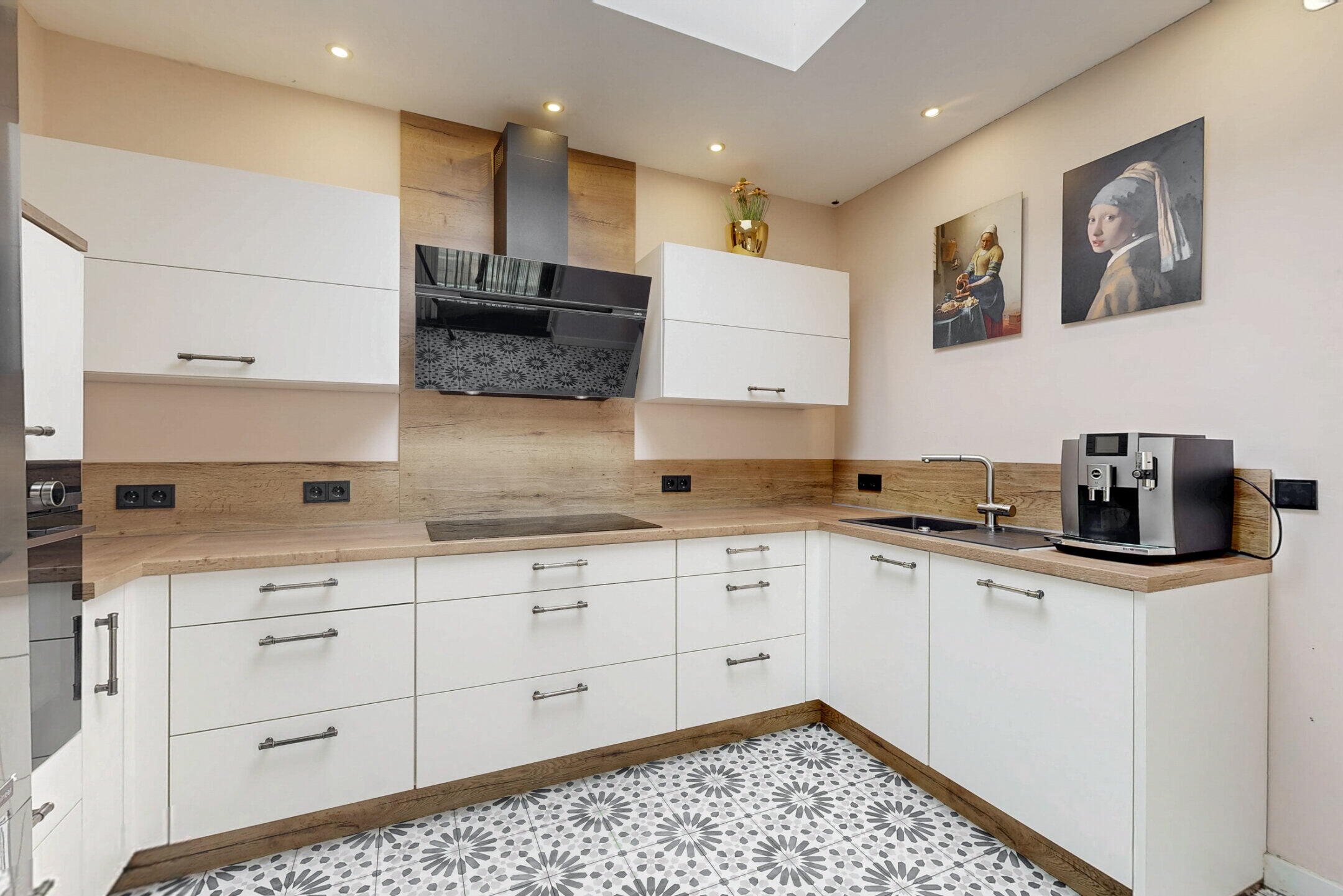 De dichte keuken (ca. 10 m2) is in 2020 volledig vernieuwd en voorzien van een inbouwvaatwasser, combi-oven, 5-pits inductiekookplaat, design afzuigkap. De vrijstaande Amerikaanse koel-vriescombinatie blijft niet achter. Vanuit de keuken komt men in de serre/achtertuin.